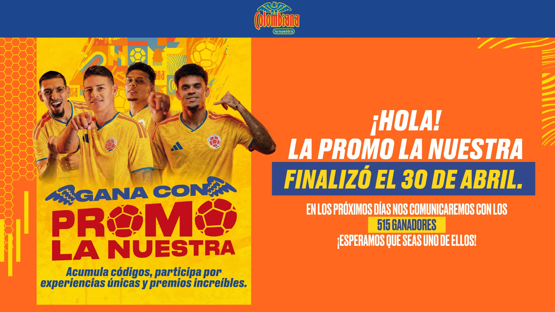 Promo del 01-03-26 al 30-04-26. 515 premios disponibles. Premios varían por puntos acumulados Aplican T&C: www.colombianalanuestra.com.co Redención Max 200 códigos al día.